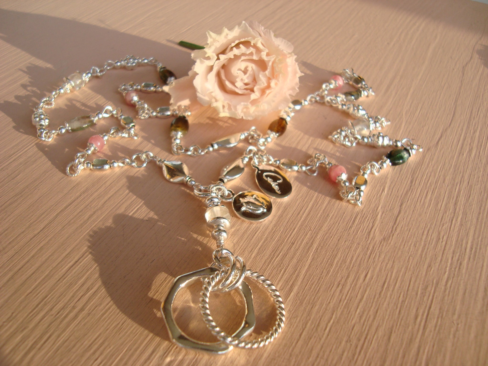 Steine: Hochwertige Turmalin-Buttons in den schönsten, turmalintypischen Farben (schöner Lüster), Bergkristall und Rhodonit-Perlen